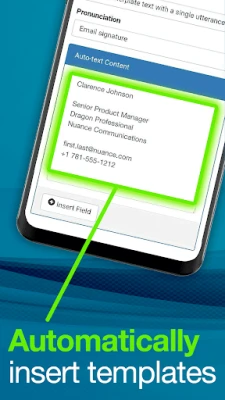 • Need to fill out forms from the road? Easily create professional form-based templates using Dragon Anywhere’s auto-texts feature and create and fill out forms, such as client in-take forms, and even navigate field to field by voice commands.