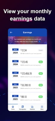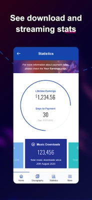 Features available to all artists: •Browse your discography •Preview your tracks •Song/account statistics •View your earnings •Create support tickets •Refer friends •Edit your profile •Connect your social profiles